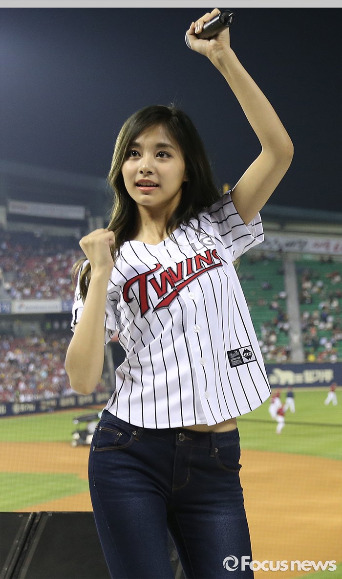 (서울=포커스뉴스) 31일 서울 잠실구장에서 열린 2016 프로야구 KIA-LG 경기에 인기 걸그룹 트와이스가 시구, 시타로 참여한뒤 경기 중간 응원단상에 올라 관중에게 노래와 춤을 선사하고 있다.