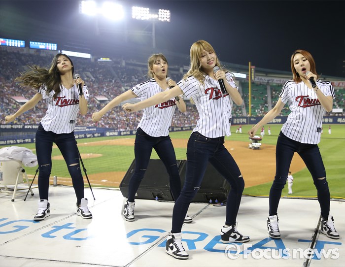 (서울=포커스뉴스) 31일 서울 잠실구장에서 열린 2016 프로야구 KIA-LG 경기에 인기 걸그룹 트와이스가 시구, 시타로 참여한뒤 경기 중간 응원단상에 올라 관중에게 노래와 춤을 선사하고 있다.