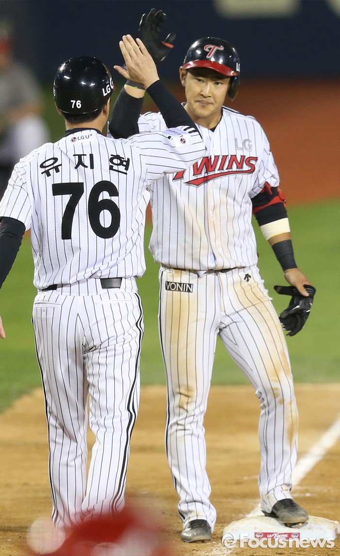 (서울=포커스뉴스) 31일 서울 잠실구장에서 열린 2016 프로야구 KIA-LG 경기 4회말 2사 만루에서 LG 정주현의 주자일소 3루타를 치고 유지현 코치의 축하를 받고 있다.