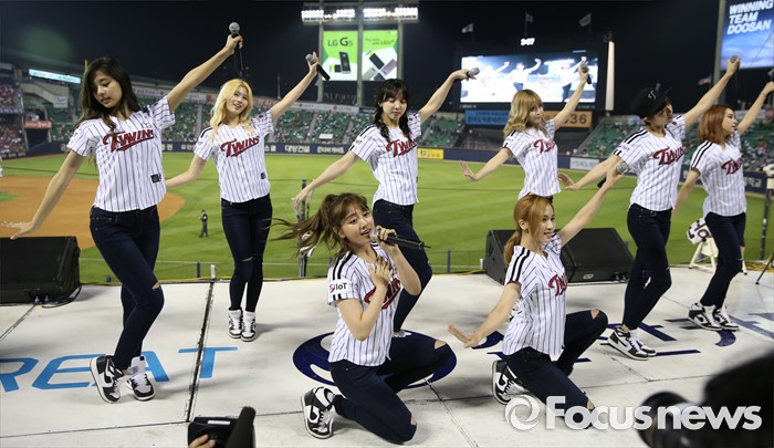 (서울=포커스뉴스) 31일 서울 잠실구장에서 열린 2016 프로야구 KIA-LG 경기에 인기 걸그룹 트와이스가 시구, 시타로 참여한뒤 경기 중간 응원단상에 올라 관중에게 노래와 춤을 선사하고 있다.