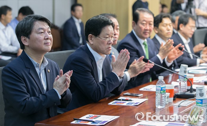 (서울=포커스뉴스) 안철수(왼쪽 첫번째) 국민의당 상임공동대표 등 의원들이 1일 오전 서울 여의도 국회 의원회관에서 열린 9차 정책역량강화 워크숍에 참석해 이기정 미양교등학교 교사의 발언을 들으며 박수치고 있다.