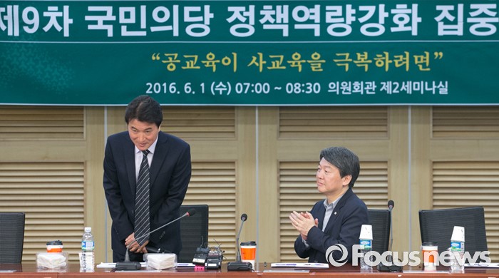 (서울=포커스뉴스) 안철수(오른쪽) 국민의당 상임공동대표가 1일 오전 서울 여의도 국회 의원회관에서 열린 9차 정책역량강화 워크숍에 참석해 이기정 미양교등학교 교사를 소개하고 있다.