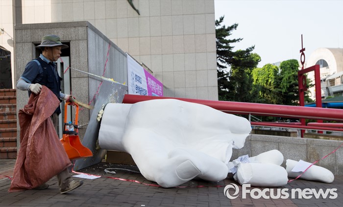 (서울=포커스뉴스) 1일 오전 서울 마포구 홍익대학교 정문에 설치된 극우성향 사이트 '일베' 상징물 조각상 파손된 채 길에 방치돼 있다. 조각상은 일간베스트저장소를 상징하는 자음 'ㅇ'과 'ㅂ' 모양을 하며 회원을 인증하는 손 모양이다. '어디에나 있고, 아무데도 없다'는 제목의 이 조각상은 조소과 4학년 홍기하씨가 '환경조각연구' 수업 과제로 제작해 야외조각전에 출품한 것이다.
