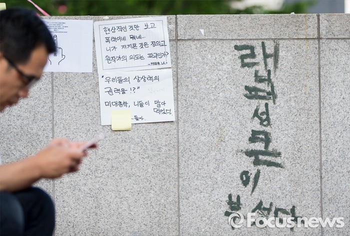 (서울=포커스뉴스) 1일 오전 서울 마포구 홍익대학교 정문에 설치된 극우성향 사이트 '일베' 상징물 조각상이 파손된 가운데 조소상이 있던 정문 아래 '랩퍼성큰이 부섯다'라는 글이 적혀있다. 조각상은 일간베스트저장소를 상징하는 자음 'ㅇ'과 'ㅂ' 모양을 하며 회원을 인증하는 손 모양이다. '어디에나 있고, 아무데도 없다'는 제목의 이 조각상은 조소과 4학년 홍기하씨가 '환경조각연구' 수업 과제로 제작해 야외조각전에 출품한 것이다.