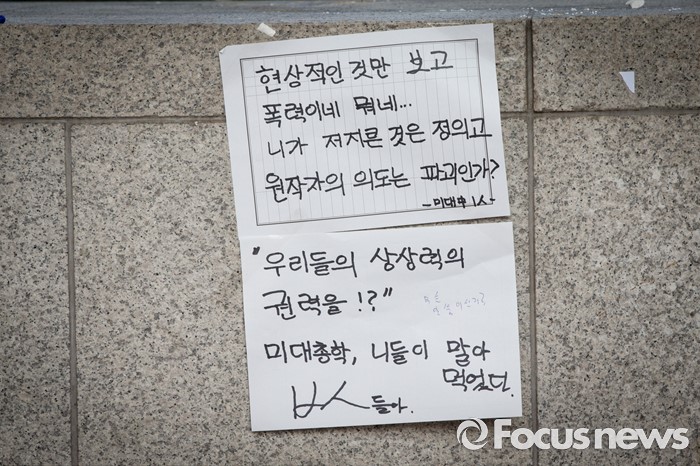 (서울=포커스뉴스) 1일 오전 서울 마포구 홍익대학교 정문에 설치된 극우성향 사이트 '일베' 상징물 조각상이 파손된 가운데 이를 비판하는 글이 담긴 종이가 정문에 붙어있다. 조각상은 일간베스트저장소를 상징하는 자음 'ㅇ'과 'ㅂ' 모양을 하며 회원을 인증하는 손 모양이다. '어디에나 있고, 아무데도 없다'는 제목의 이 조각상은 조소과 4학년 홍기하씨가 '환경조각연구' 수업 과제로 제작해 야외조각전에 출품한 것이다.