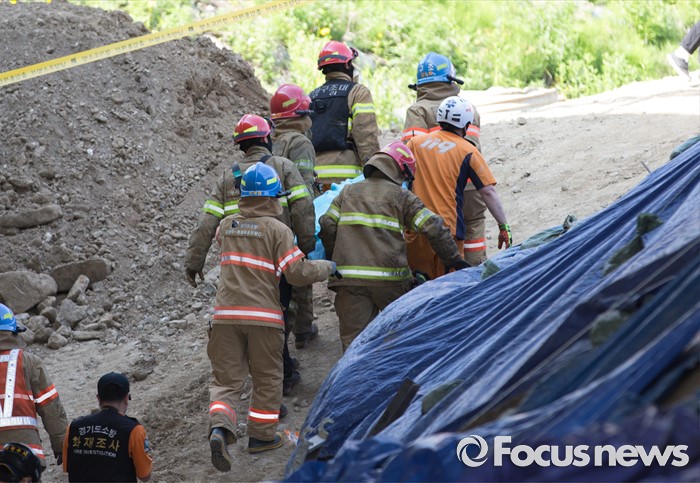 (남양주=포커스뉴스) 1일 오전 7시 20분께 경기 남양주시 진전읍 금곡리 진접석 지하철 공사현장이 붕괴되는 사고가 발생해 소방대원들이 구조작업을 하고 있다.
