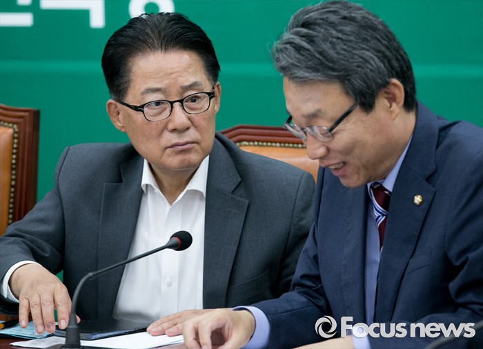 (서울=포커스뉴스) 1일 오전 서울 여의도 국회에서 열린 국민의당 최고위원회의에 참석한 박지원(왼쪽) 원내대표와 김성식 정책위의장이 대화하고 있다.