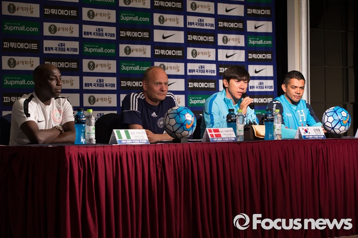 (인천=포커스뉴스) 1일 오전 인천 연수구 라마다송도호텔에서 열린 4개국 올림픽 국가대표 축구대회 공식 기자회견에서 참가국 감독과 수석코치가 취재진 질문에 답하고 있다. 왼쪽부터 삼손 시아시아 나이지리아 감독, 닐스 프레드닉센 덴마크 감독, 신태용 대한민국 감독, 아마도 궤바라 온두라스 수석코치.
