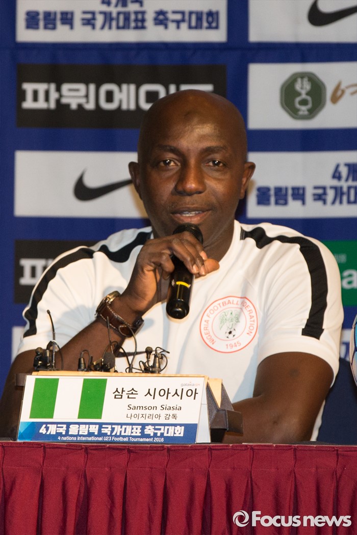 (인천=포커스뉴스) 1일 오전 인천 연수구 라마다송도호텔에서 열린 4개국 올림픽 국가대표 축구대회 공식 기자회견에 참가한 삼손 시아시아 나이지리아 감독이 취재진 질문에 답하고 있다.