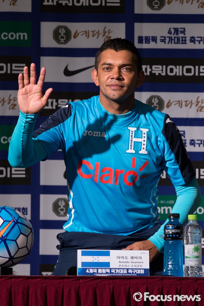(인천=포커스뉴스) 1일 오전 인천 연수구 라마다송도호텔에서 열린 4개국 올림픽 국가대표 축구대회 공식 기자회견에 참가한 아마도 궤바라 온두라스 수석코치가 인사를 하고 있다.