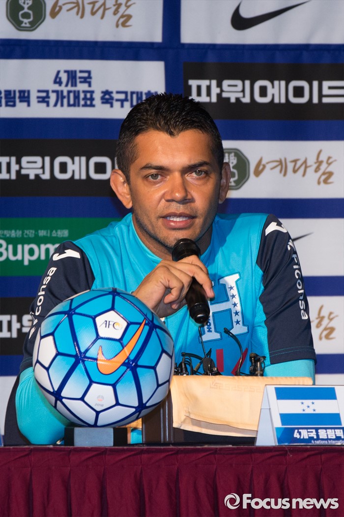 (인천=포커스뉴스) 1일 오전 인천 연수구 라마다송도호텔에서 열린 4개국 올림픽 국가대표 축구대회 공식 기자회견에 참가한 아마도 궤바라 온두라스 수석코치가 취재진 질문에 답하고 있다.