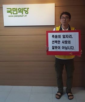 지난달 28일 정비용역업체 직원 김모(19)씨가 서울 지하철 2호선 구의역에서 스크린도어 보수작업을 하다 숨지는 사고가 발생했다.박정훈 알바노조 위원장이 1일 오전 서울 마포구 국민의당사 앞에서 1인시위를 벌이고 있다. <사진제공=알바노조>