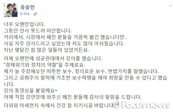 유승민 의원은 이날 오전 자신의 페이스북을 통해 "너무 오랜만입니다. 그동안 인사를 못 드려 미안합니다"라면서 이같이 말했다. 넉달 만의 페이스북 글이다.