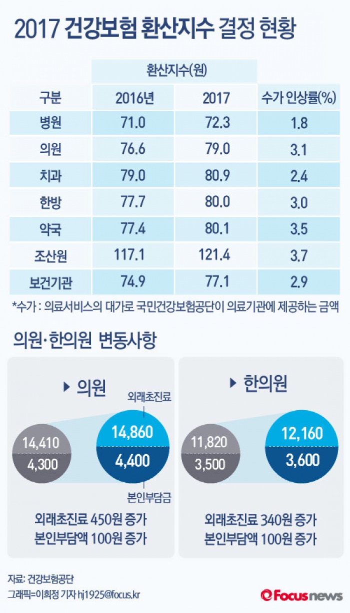 (서울=포커스뉴스) 1일 국민건강보험공단 발표에 따르면 의료서비스의 대가인 '수가' 인상으로 내년 건보재정 8134억원을 추가로 투입할 예정이라고 밝혔다. 수가는 병원 1.8%, 의원 3.1%, 치과 2.4%, 약국 3.5%, 한방 3.0% 올랐다.