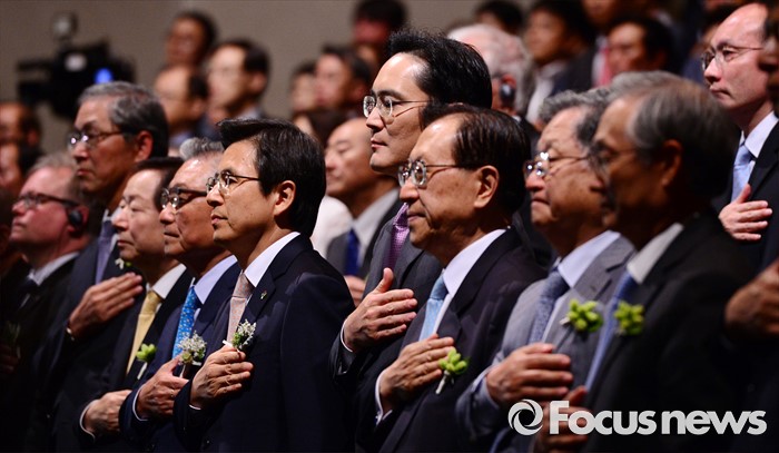 (서울=포커스뉴스) 1일 오후 서울 중구 호암아트홀에서 열린 제26회 호암상 시상식에 참석한 황교안(왼쪽 다섯번째 부터) 국무총리와 이재용 삼성전자 부회장이 국민의례를 하고 있다.