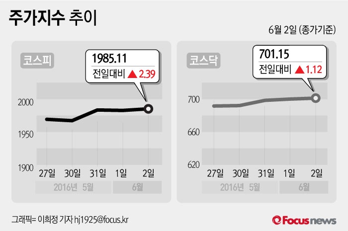 (서울=포커스뉴스) 2일 코스피지수는 전날 보다 0.12%(2.39포인트) 오른 1985.11에 장을 마쳤다. 코스닥지수는 전일 대비 0.16%(1.12포인트) 오른 701.15에 마감했다.