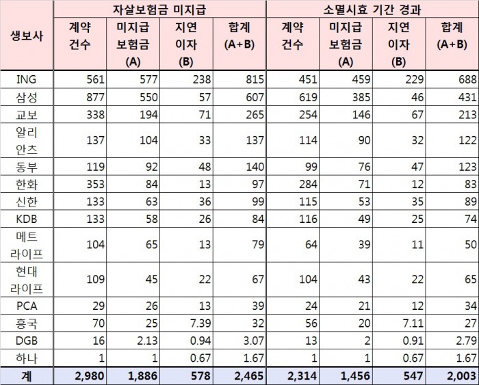 한편, 2016년 2월 26일 기준으로 14개 생보사가 미지급한 자살보험금은 2980건, 2465억원이다. 이중 소멸시효 기간 경과건은 2314건(78%) 2003억원(81%)이다. 자살보험금 미지급 건수는 삼성생명(877건) ING생명(561건) 한화생명(353건) 교보생명(338건) 알리안츠생명(137건) 신한·KDB생명(각 133건) 동부생명(119건)현대라이프(109건) 메트라이프(104건) 등의 순이다.