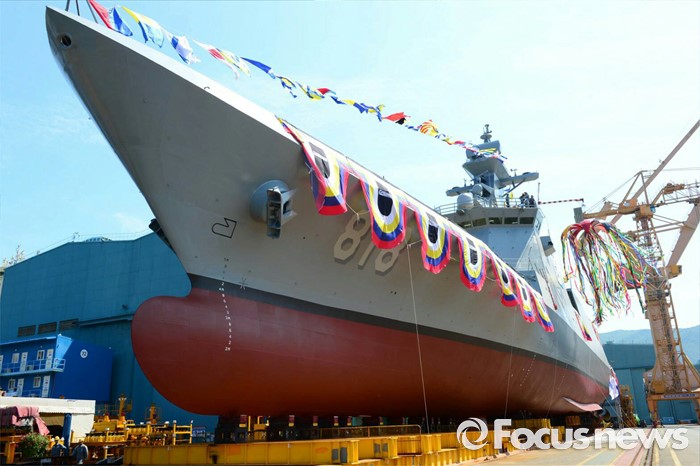 (서울=포커스뉴스) 2일 오후 경남 거제 대우조선해양에서 해군의 신형 호위함인 대구함이 모습을 드러내고 있다. 전투함 최초로 하이브리드 추진체계를 적용한 해군의 신형 호위함(FFG-Ⅱ, 2800톤급)인 대구함은 대공 · 대함 · 대잠 · 대지전까지 수행할 수 있다. <사진제공= 해군>