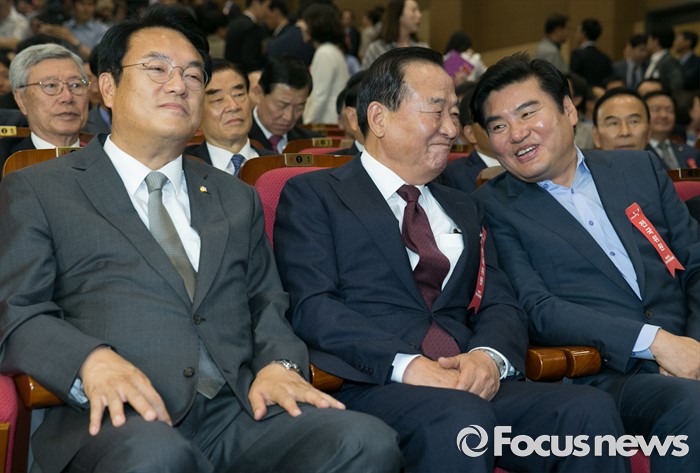 (서울=포커스뉴스) 2일 오후 서울 여의도 국회 의원회관에서 열린 새누리당 4차 전국위원회에 참석한 서청원(가운데) 전 최고위원과 원유철(오른쪽) 전 원내대표가 대화하고 있다. 왼쪽은 정진석 원내대표.
