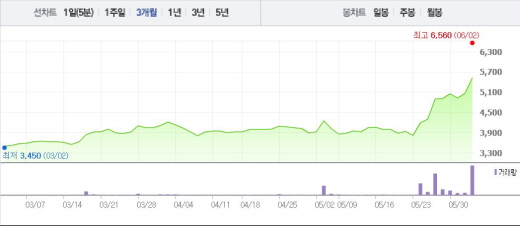 외국인이 매수에 나서면서 24일부터 1일까지(31일 제외) 6거래일 연속 상승세를 나타냈다. 같은 달 23일 3820원이였던 주가와 비교했을 때 144.5% 상승한 수치다.
