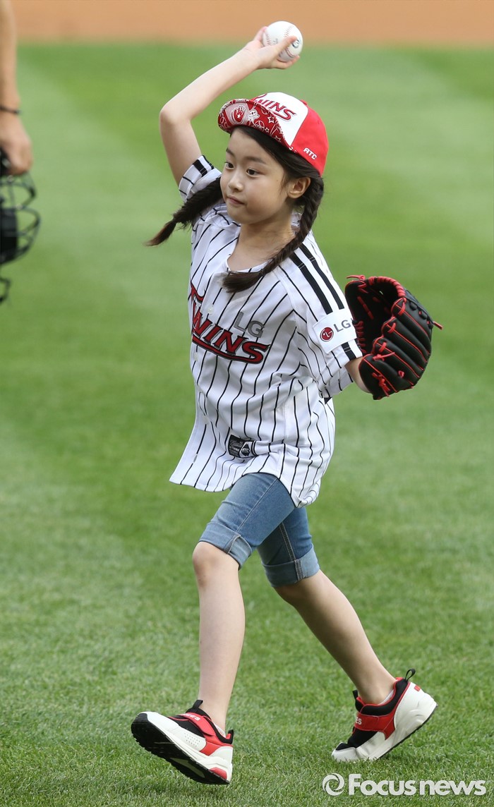 (서울=포커스뉴스) 1일 서울 잠실구장에서 열린 2016 프로야구 KIA-LG 경기에 앞서 TV 드라마 '내딸 금사월'에 출연했던 아역배우 이나윤 어린이가 시구하고 있다.