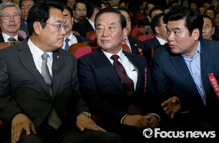 (서울=포커스뉴스) 2일 오후 서울 여의도 국회 의원회관에서 열린 새누리당 4차 전국위원회에 참석한 정진석(왼쪽부터) 원내대표와 서청원 전 최고위원, 원유철 전 원내대표가 대화하고 있다.