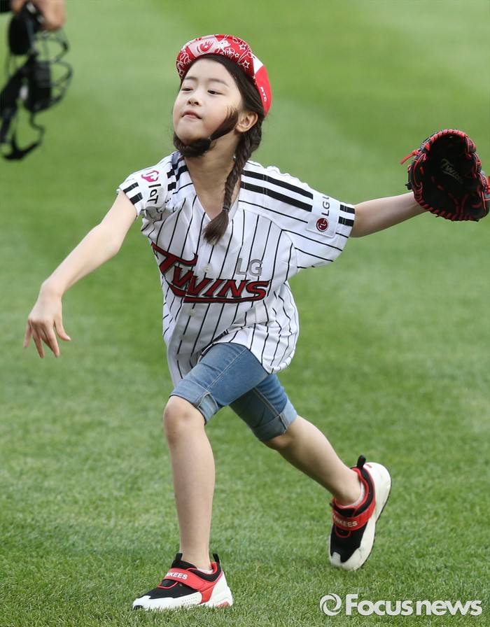(서울=포커스뉴스) 1일 서울 잠실구장에서 열린 2016 프로야구 KIA-LG 경기에 앞서 TV 드라마 '내딸 금사월'에 출연했던 아역배우 이나윤 어린이가 시구하고 있다.