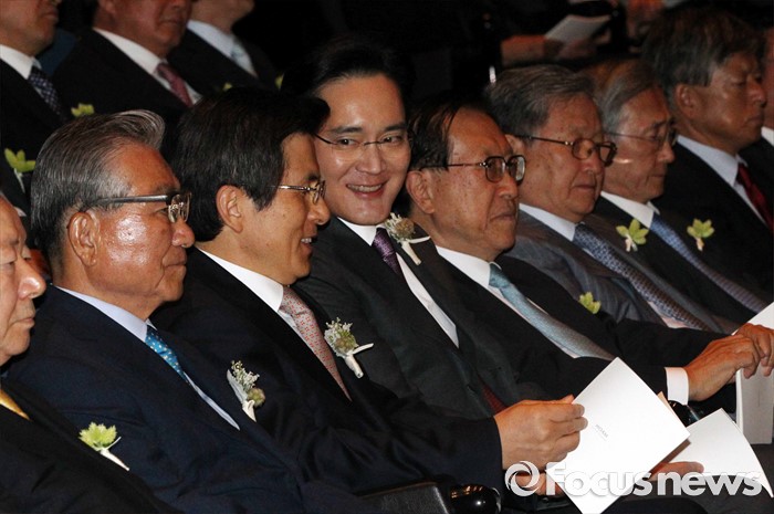 (서울=포커스뉴스) 1일 오후 서울 중구 호암아트홀에서 열린 제26회 호암상 시상식에 참석한 황교안(앞줄 왼쪽 세번째부터) 국무총리와 이재용 삼성전자 부회장이 대화하고 있다.