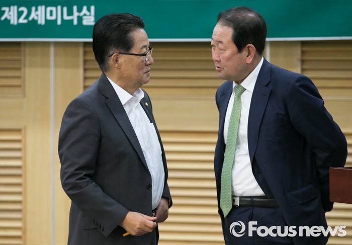 (서울=포커스뉴스) 2일 오전 서울 여의도 국회 의원회관에서 열린 국민의당 정책역량강화 집중 워크숍에 참석한 박지원(왼쪽) 원내대표와 박주선 최고위원이 대화하고 있다.