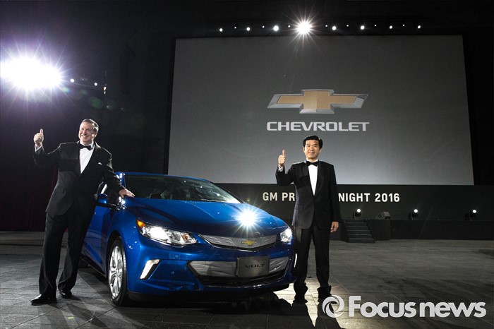 (부산=포커스뉴스) 1일 오후 부산 해운대구 우동에 위치한 영화의 전당에서 열린 GM 프리미어 나이트에서 한국 지엠의 제임스 김(오른쪽) CEO와 데일 설리번 부사장이 신차 볼트(VOLT) 앞에서 포즈를 취하고 있다.