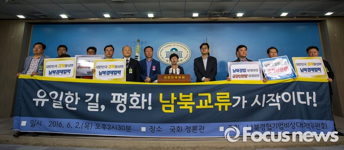 (서울=포커스뉴스) 2일 오후 서울 여의도 국회에서 열린 '남북경협기업 생존대책마련 촉구 기자회견'에 참석한 남북경협기업비상대책위원회 관계자들이 정부에 개성공단 재개 및 금강산 관광 재개 등을 촉구 하고 있다.