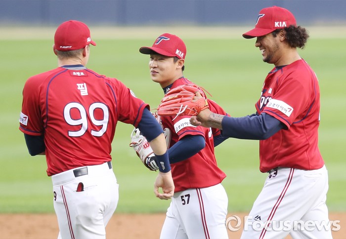 (서울=포커스뉴스) 1일 서울 잠실구장에서 열린 2016 프로야구 KIA-LG 경기에서 KIA 투수 헥터, 우익수 이진영, 1루수 필이 1회말 수비를 마치고 밝은 표정으로 대화하며 덕아웃으로 뛰어가고 있다.