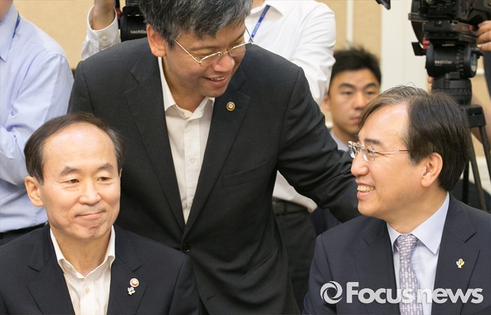 (서울=포커스뉴스) 2일 오전 서울 여의도 국회 귀빈식당에서 열린 미세먼지 대책 관련 당정협의에 참석한 장, 차관들이 인사하고 있다. 왼쪽부터 윤성규 환경부 장관, 최상목 기획재정부 1차관, 이석준 국무조정실장.