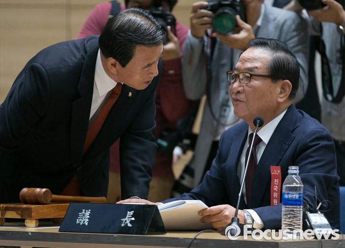 (서울=포커스뉴스) 2일 오후 서울 여의도 국회 의원회관에서 열린 새누리당 4차 전국위원회에 참석한 서청원(오른쪽) 전국위의장 대행과 홍문표 사무총장 대행이 대화하고 있다.