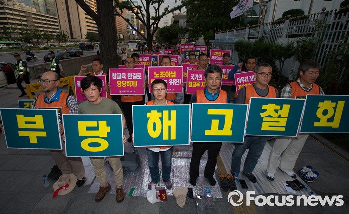 (서울=포커스뉴스) 전국교직원노동조합 조합원들이 1일 오후 서울 종로구 정부서울청사 앞에서 열린 '법외노조 탄압, 부당해고 규탄 48시간 집중행동 투쟁문화재'에서 부당해고 중단을 촉구하는 구호를 외치고 있다.