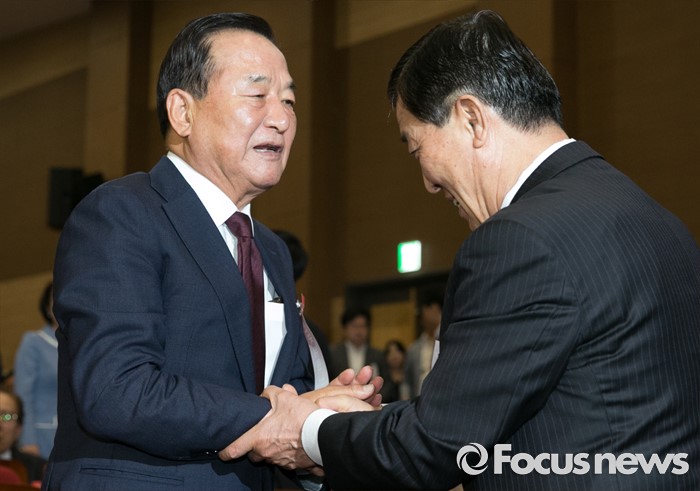 (서울=포커스뉴스) 2일 오후 서울 여의도 국회 의원회관에서 열린 새누리당 4차 전국위원회에 참석한 서청원(왼쪽) 전 최고위원과 황진하 전 사무총장이 인사하고 있다.