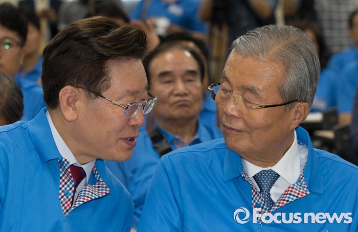 (괴산=포커스뉴스) 김종인(오른쪽) 더불어민주당 비대위 대표가 1일 오후 충북 괴산 성불산자연휴양림에서 열린 충북도당 핵심당직자 워크숍에 참석, 이재명 성남시장과 대화하고 있다.