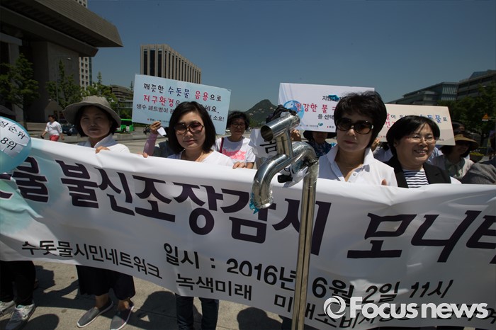 (서울=포커스뉴스) 2일 오전 서울 종로구 광화문 광장에서 수돗물 시민네트워크 관계자들이 수돗물 불신조장감시센터 방송 모니터링단 발대식을 열고 있다.