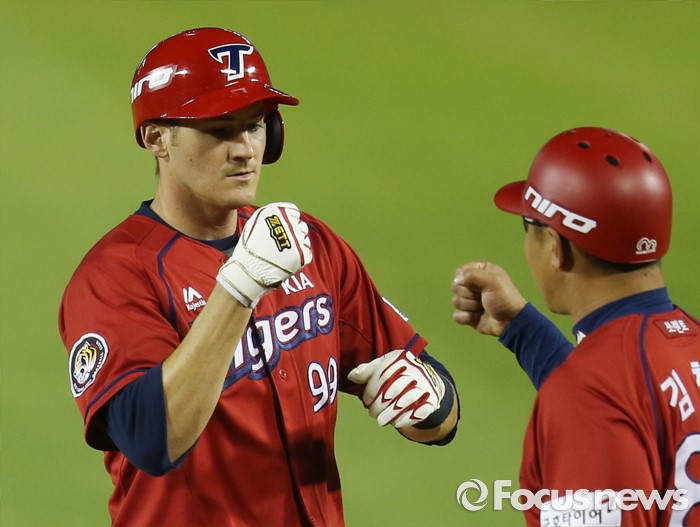 (서울=포커스뉴스) 1일 서울 잠실구장에서 열린 2016 프로야구 KIA-LG 경기 6회초 무사 만루에서 KIA 필이 2타점 좌중간 안타를 치고 1루에서 김창희 코치의 축하를 받고 있다.