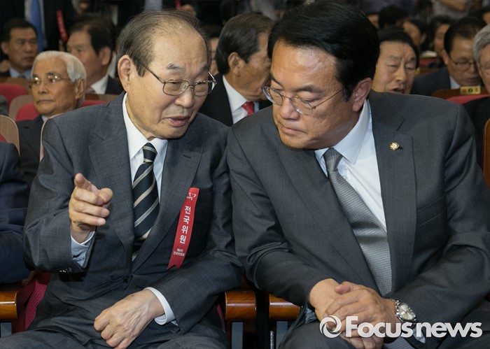 (서울=포커스뉴스) 2일 오후 서울 여의도 국회 의원회관에서 열린 새누리당 4차 전국위원회에 참석한 정진석(오른쪽) 원내대표와 정재철 상임고문이 대화하고 있다.