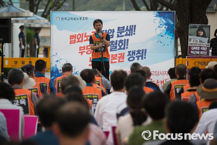 (서울=포커스뉴스) 전국교직원노동조합 노조원들이 1일 오후 서울 종로구 정부서울청사 앞에서 열린 '법외노조 탄압, 부당해고 규탄 48시간 집중행동 투쟁문화재'에 참석하고 있다.