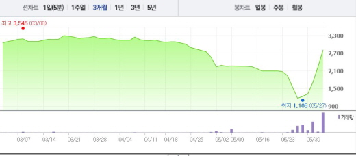 STX는 2일 오전 9시32분 전일 대비 24.83%(555원) 상승한 2790원에 거래되고 있다. STX는 5월27일부터 이달 1일까지 4거래일 연속 상승세를 기록했다. 특히 5월31일과 6월1일에는 29%를 넘는 상승폭을 나타내기도 했다.