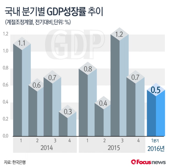 2일 한국은행은 ‘2016년 1분기 및 연간 국내총생산(잠정)’을 통해 올 1분기 실질 GDP가 전기 대비 0.5% 성장했다고 밝혔다. 이는 지난 4월 발표한 속보치보다 0.1%포인트 상향 조정된 수치다.