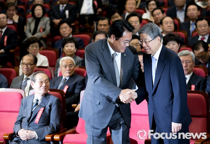 (서울=포커스뉴스) 2일 오후 서울 여의도 국회 의원회관에서 열린 새누리당 4차 전국위원회에 참석한 정진석(왼쪽) 원내대표와 공식 선출된 김희옥 혁신비대위원장이 악수하고 있다.