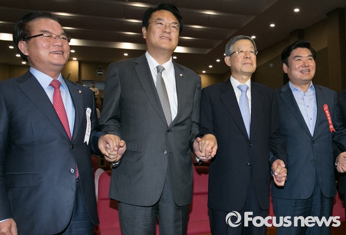 (서울=포커스뉴스) 2일 오후 서울 여의도 국회 의원회관에서 열린 새누리당 4차 전국위원회에 참석한 정진석 원내대표와 공식 선출된 김희옥 혁신비대위원장 등이 취재진을 향해 포즈를 취하고 있다. 왼쪽부터 정갑윤 신임 전국위의장, 정 원내대표, 김 위원장, 원유철 전 원내대표.