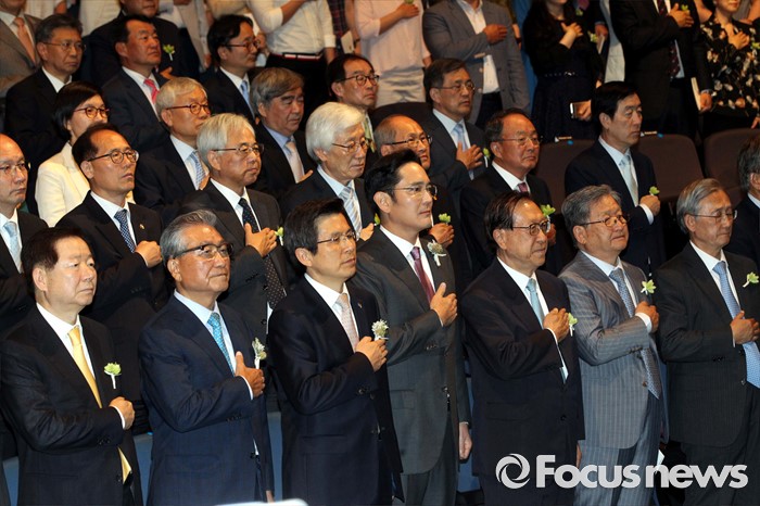 (서울=포커스뉴스) 1일 오후 서울 중구 호암아트홀에서 열린 제26회 호암상 시상식에 참석한 황교안(앞줄 왼쪽 세번째부터) 국무총리와 이재용 삼성전자 부회장이 국민의례를 하고 있다.