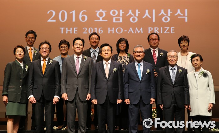 (서울=포커스뉴스) 1일 오후 서울 중구 호암아트홀에서 열린 제26회 호암상 시상식에서 황교안 국무총리, 이재용 삼성전자 부회장이 수상자들과 기념촬영을 하고 있다.