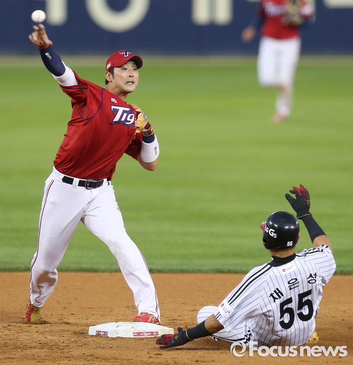 (서울=포커스뉴스) 1일 서울 잠실구장에서 열린 2016 프로야구 KIA-LG 경기 4회말 1사 1루에서 LG 김용의의 유격수앞 땅볼때 1루주자 채은성이 2루에서 포스아웃되고 있다. KIA 2루수 서동욱이 1루로 송구했으나 타자 주자는 세이프됐다.