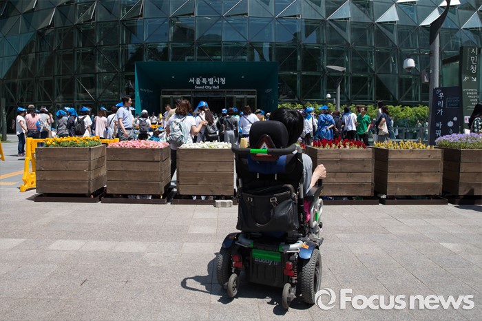 (서울=포커스뉴스) 2일 오후 서울 중구 서울시청 정문 앞에서 장애인부모연대원들이 발달장애인 정책수립을 촉구하며 삭발식을 하는 가운데 한 참석자가 휠체어를 타고 바라보고 있다.