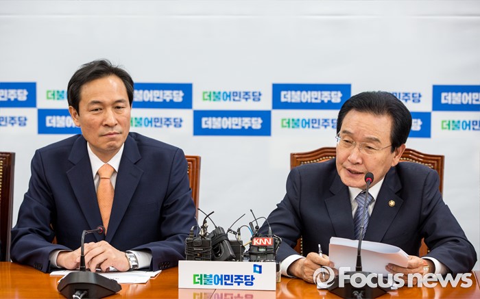 (서울=포커스뉴스) 변재일(오른쪽) 더불어민주당 정책위의장이 2일 오전 서울 여의도 국회에서 열린 정책조정회의에 참석해 모두발언 하고 있다.